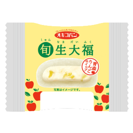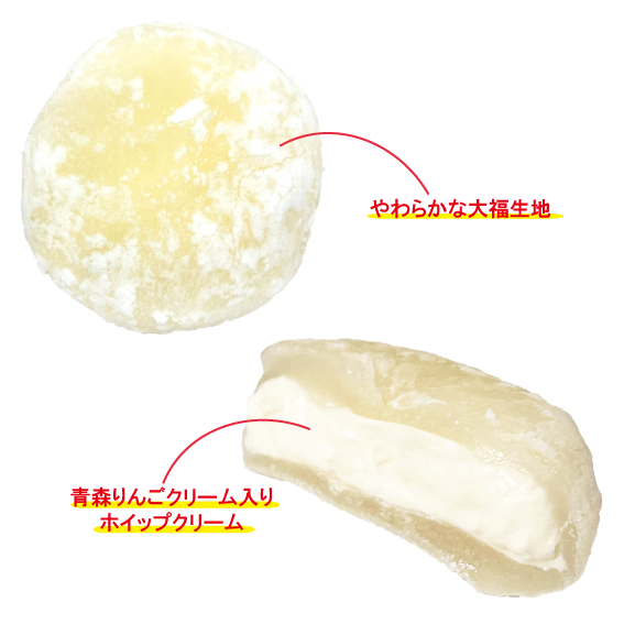 青森りんごクリームを混ぜた生クリーム入りホイップクリームをやわらかな大福生地で包みました。