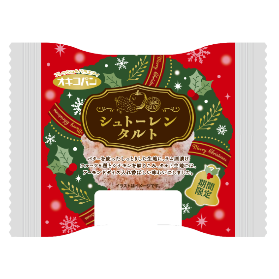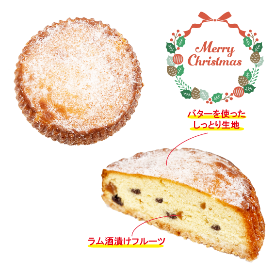 バターを使ったしっとりした生地に、洋酒漬けフルーツ6種とシナモンを練り込み、タルト生地には、アーモンドダイスを入れ香ばしい味わいにしました。
