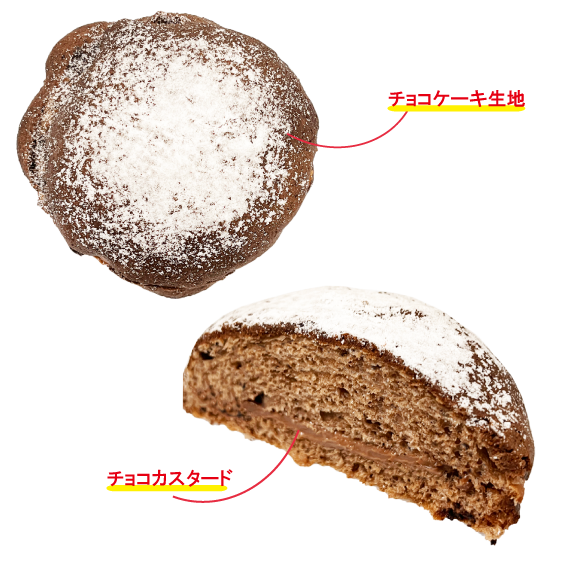 チョコチップ入り生地にチョコケーキ生地をのせて焼き上げ、チョコカスタードをサンドして粉糖をトッピングしました。