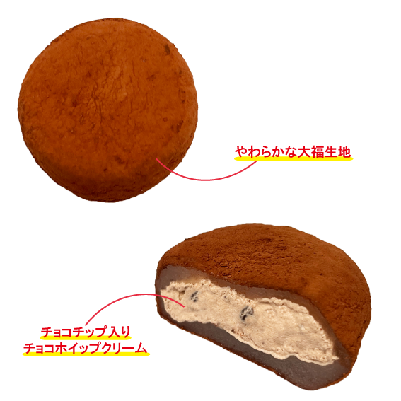 チョコチップを混ぜた生クリーム入りチョコホイップクリームをやわらかな大福生地で包み、ココアで仕上げました。