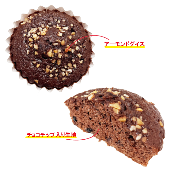 チョコチップ入りのチョコケーキにアーモンドダイスをトッピングして焼き上げました。