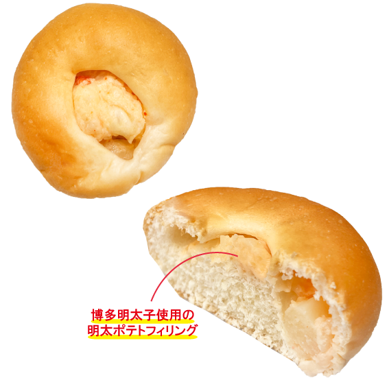博多明太子を使用したピリッと辛味のある明太子マヨネーズとポテトサラダを混ぜ、しっとりとしたパン生地に包んで焼き上げました。